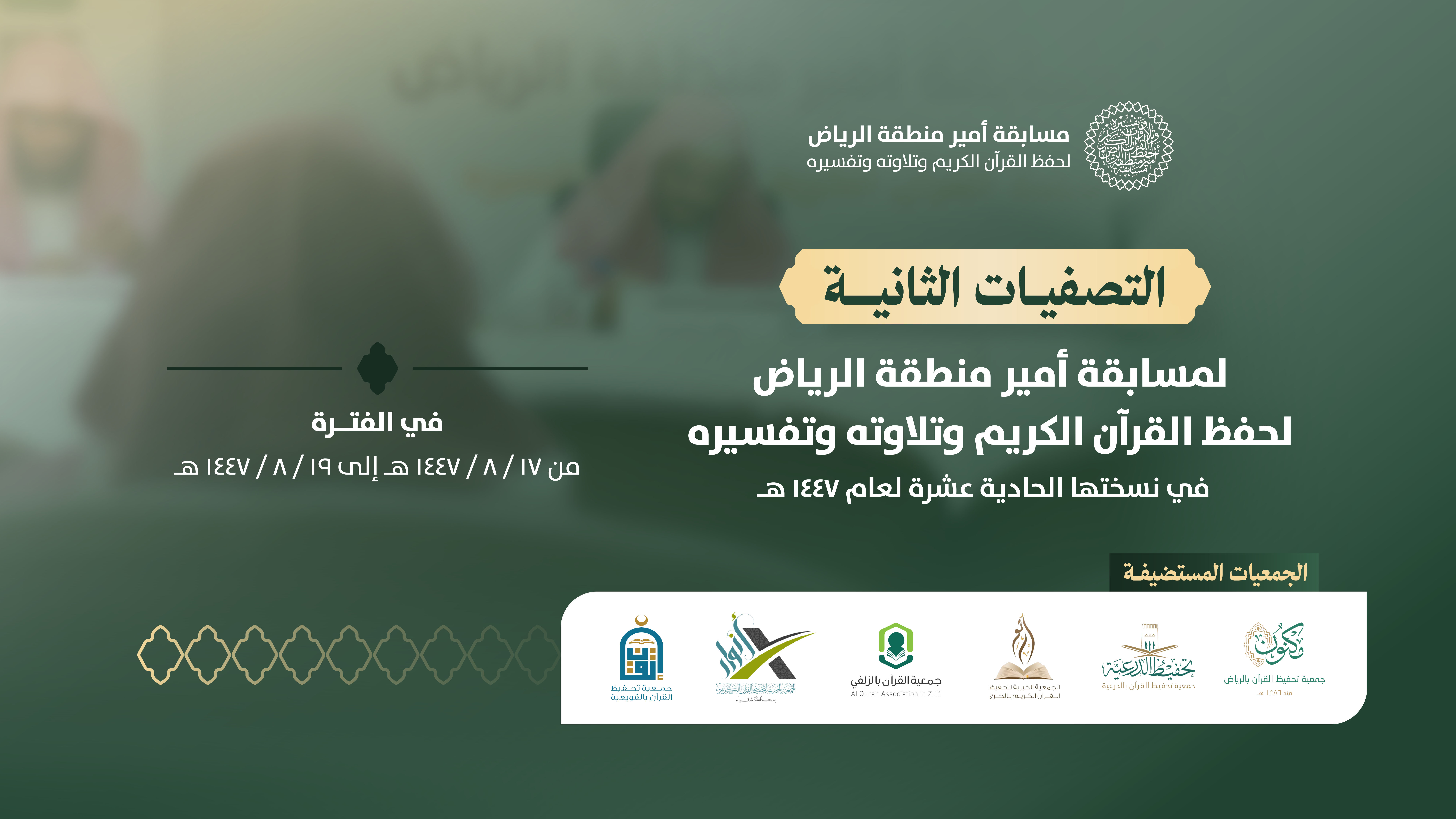 انطلقت صباح يوم السبت 19 /8 /1447 هـ التصفيات الثانية لمسابقة أمير منطقة الرياض لحفظ القرآن الكريم وتلاوته وتفسيره للبنات والتي تستضيفها جمعية تحفيظ القرآن الكريم (إتقان) بمحافظة القويعية ،تأكيدًا على