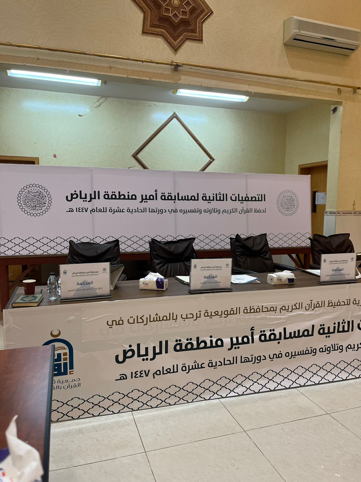 انطلقت صباح يوم السبت 19 /8 /1447 هـ التصفيات الثانية لمسابقة أمير منطقة الرياض لحفظ القرآن الكريم وتلاوته وتفسيره للبنات والتي تستضيفها جمعية تحفيظ القرآن الكريم (إتقان) بمحافظة القويعية ،تأكيدًا على ماتوليه قيادتنا الرشيدة أيدها الله من اهتمام بالغ بكتاب الله ودعمٍ مستمر لمسيرة حفظه وتعليمه.»